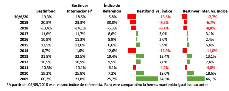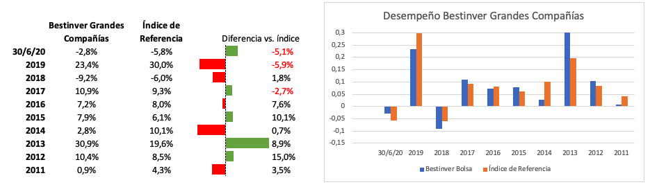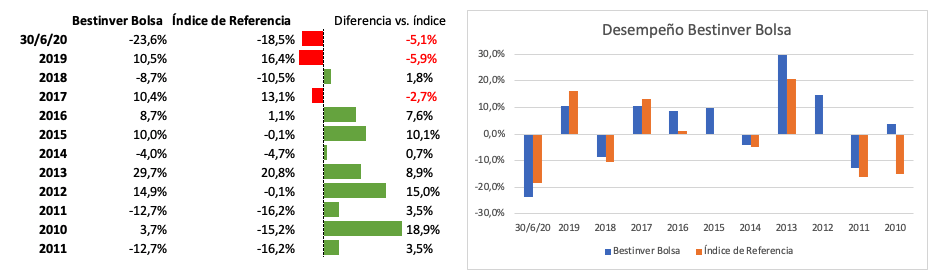 El comportamiento de este fondo en lo que va del año es una rentabilidad negativa del -26,13% a día de ayer y de -23,6% al cierre de junio, que compara negativamente con una caída del 18,5% del índice de referencia (70% IGBM y 30% PSI). Sin embargo, analizando el desempeño en un periodo de 10 años se observa que únicamente en dos años (2019 y 2017) la rentabilidad del fondo fue peor que la de su índice de referencia, habiendo años en donde el fondo superaba al índice en más de 10 puntos porcentuales (2015, 2012 y 2010). La rentabilidad mediaanualizada desde su lanzamiento es de 8,64% y ha recibido a lo largo de su historia 16 reconocimientos.