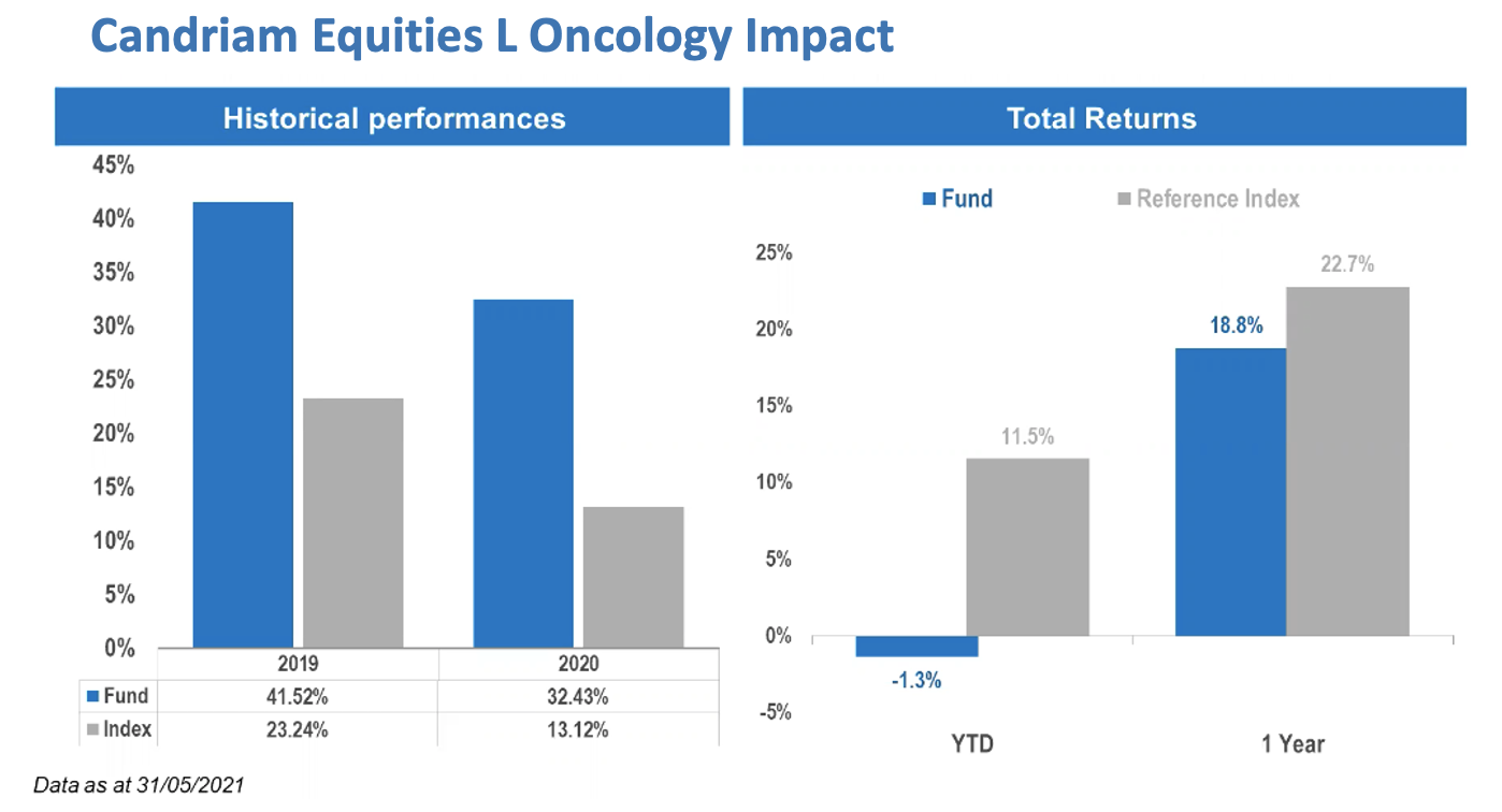 Respecto a los fondos que gestiona Van den Eynde, tanto el fondo Candriam Equities L Biotechnology como el fondo Oncology Impcat siguen manteniendo un track record indiscutiblerespecto a su índice de referencia en sus años de historia, a pesar de que este año el desempeño es inferior aunque realmente los fundamentales no han cambiado, sino que el entorno está apostando por los valores más cíclicos, como los productores de vacunas en las que el gestor ha decidido estar infraponderado.
