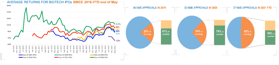 En cuanto a la financiación de la industria, se comentó que las ofertas públicas iniciales (IPO) está siendo muy activo, con 83 colocaciones en 2020 de empresas de biotecnología y 36 de oncología, mientras que en lo que va de 2021 van 47 y 19 respectivamente, dándoles casi 2.5 años de liquidez para invertir en proyectos de I&D, con balances muy sanos. Varias de estas empresas que salen al mercado están en etapas muy iniciales y por tanto hay que ser muy selectivos y pacientes para recoger beneficios. Como se observa en el siguiente gráfico, es importante tener una capacidad de permanecer en el tiempo ya que el comportamiento de corto plazo suele ser muy errático.