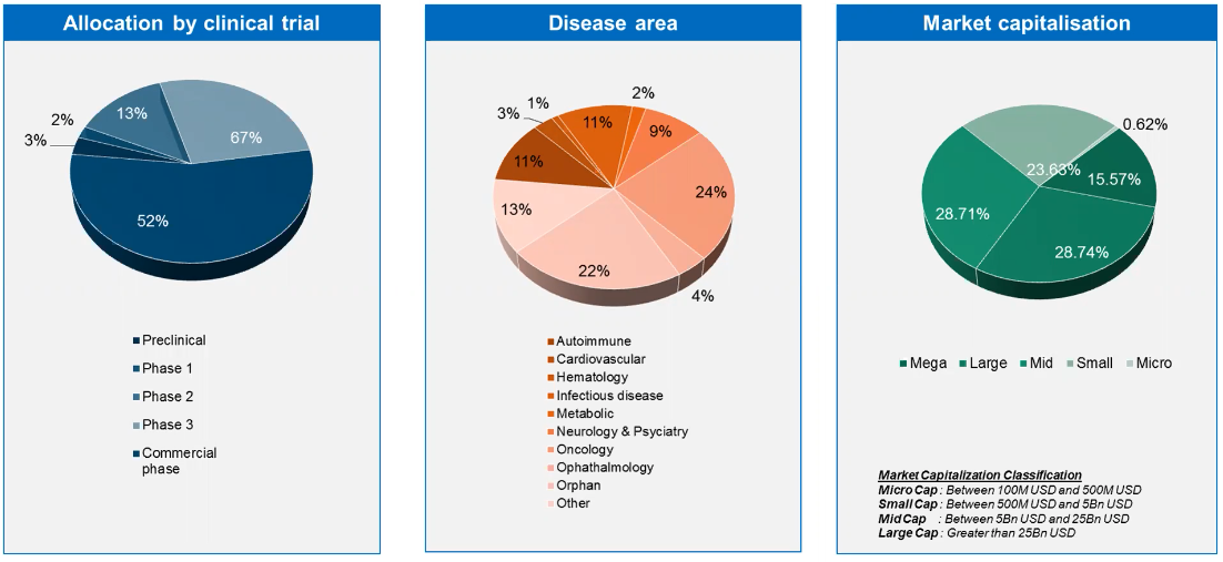 Una manera diferente de ver la típica asignación es la que presentó Rudy en el webinario, donde comenta que el 52% de la cartera está integrado por empresas en estado preclínico, candidatas a ser aprobadas, solo un 3% están en la fase de comercialización. En cuanto a capitalización de mercado, casi el 60% mega y gib caps, 15,57% en medianas, mientras que small y micro casi un 24,5%. Una cartera bastante diversificada tanto por estado clínico, como por el área de enfermedad o capitalización.