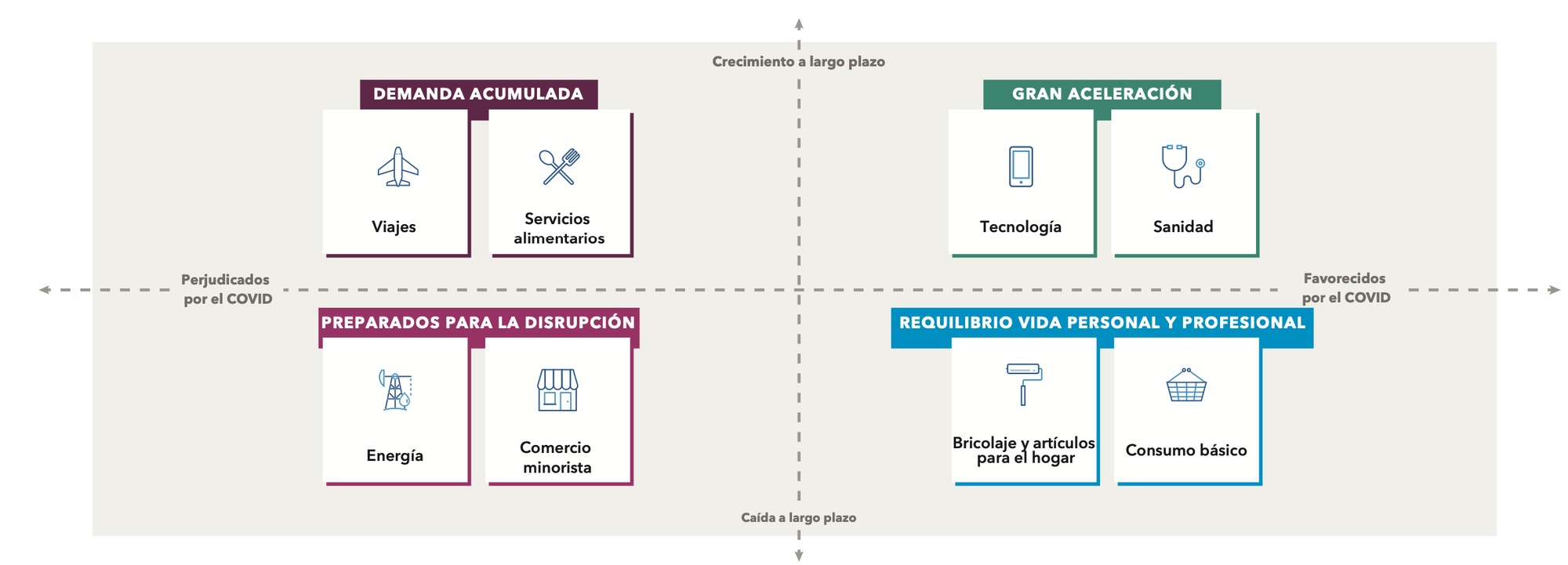 Según muestra el informe de la gestora, los principales sectores se movieron en direcciones muy diferentes y hay algunos que se vieron favorecidos y otros afectados por el Covid. Entre los desfavorecidos están el de viajes y servicios alimentarios que tienen demanda acumulada, pero también aquellos afectados por un temor a una fuerte recesión como energía y comercio minorista. Pero también hay otros que gozaron de una fuerte aceleración del negocio como la tecnología, sanidad, consumo básico y bricolaje o artículos para el hogar por el teletrabajo.