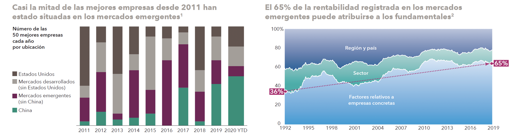 Julie dice que es una creyente convencida de las posibilidades del mercado de renta variable y una fiel inversora de mercados emergentes. De hecho, hace hincapié de que casi la mitad de las mejores empresas desde 2011 han estado situadas en los mercados emergentes y el 65% de la rentabilidad registrada en los mismos puede atribuirse a sus fundamentales.