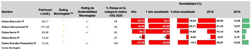 - Cobas Selección (451,7 millones de euros) que es un fondo de autor donde al menos el 80% de la exposición será renta variable sin restricción de capitalización y hasta un 40% en mercados emergentes, y
