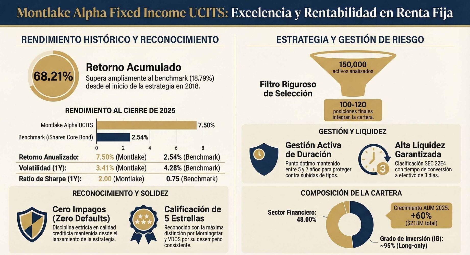 La idea de la liquidez del fondo también me gustó. No es que sean únicos, pero me llamó la atención la importancia que le daba Leonard. En un mercado donde cada vez se venden más estrategias ilíquidas con la promesa de rentabilidades superiores, Montlake Alpha Fixed Income mantiene una postura casi contracultural: liquidez total.