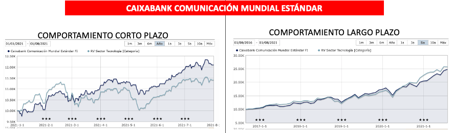 - Caixabank Comunicación Mundial Estándar: un fondo con un patrimonio de 791,9 millones de euros, de renta variable internacional, con un indicador de sostenibilidad de Morningstar de 4 globos, y tres estrellas de rating cualitativo.. Alcanza una rentabilidad hasta el cierre de julio de 21,5%, pero además en todos los años anteriores ha alcanzado rentabilidades positivas, incluso en 2018. Se posiciona este año el en percentil 21 de los fondos con mejor desempeño, habiendo sido su mejor trimestre el primero, cuando alcanzó una rentabilidad ligeramente superior al 10%. Su cartera, compuesta por 90 posiciones y donde las 10 mayores representan casi el 47% del patrimonio, tiene un marcado estilo growth y de gran capitalización. Tiene una sobreponderación en Norteamérica (más del 77% de peso), seguida por Europa desarrollada con 11%. Entre sus mayores apuestas se encuentra Apple (9,1% de peso), Microsoft (8,6%), Facebook (6,1%), Alphabet con dos clases de acciones C y A que suman 11,14%, y en menor proporción Walt Disney, Alibaba, Visa y Vivendi.