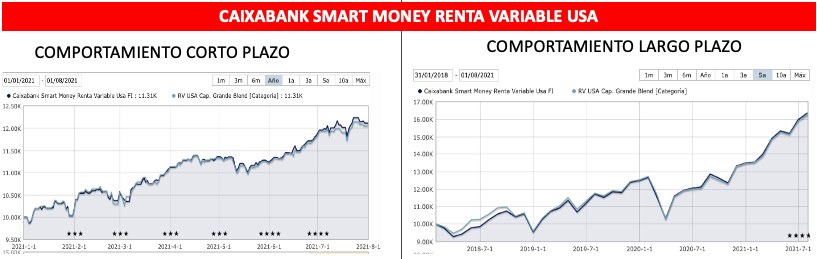 - Caixabank Smart MONEY Renta Variable USA: se trata de otro fondo de renta variable que invierte en EE.UU en ETFs, futuros y empresas de gran capitalización, tomando como referencia la rentabilidad del índice S&P Total Return. El patrimonio ronda los 770 millones de euros, alcanza una rentabilidad en el año del 18,37% pero se sitúa en el percentil 51, y de manera similar en 2019 y 2020. Morningstar le otorga 4 estrellas. En cuanto a exposición sectorial no se observa una clara sobre o infra ponderación, aunque el sector con mayor peso es tecnología, seguido de servicios financieros.