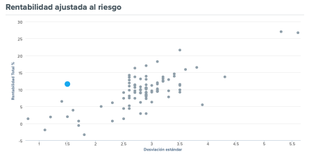De acuerdo a datos de Citywire, el fondo se posiciona en el lugar 27 de 90 fondos de renta fija – deuda corporativa euro, pero en la posición 3 y 5 respecto a máxima caída y desviación estándar a tres y cinco años, mientras que en cuartil segundo por rentabilidad. Es una atractiva propuesta como se observa en binomio rentabilidad / riesgo: