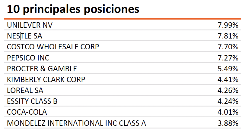 El patrimonio del fondo alcanza los casi 240 millones de dólares, a pesar de ser un fondo con una antigüedad de más de 20 años. Según la última ficha disponible, entre sus 10 mayores posiciones se encuentran Unilever, Nestlé Costco, Pepsico, Procter & Gamble, entre otras...y es Norteamérica la región con mayor peso, seguida de Europa. En cuanto a sectores, prácticamente el 70% de la cartera está en Bebidas, alimentación y comercio minorista.