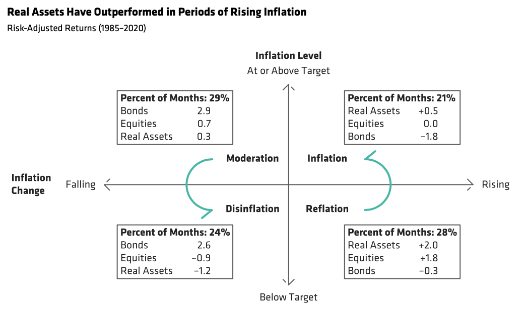 La diversificación de carteras a nivel global puede llevar a reforzar exposición en renta variable y renta fija. Sin embargo, hay una pieza que pude ser crucial para defender las carteras en tiempos de inflación, y son los activos reales. Según el análisis realizado por los gestores de AB - Vinod Chathlani y Mark Gleason - es difícil cumpar a los inversores por descuidar la baja o nula exposición a activos reales, ya que habiendo estado controlada la inflación en la mayor parte de la década aunado a rentabilidades de los activos reales por detras de la RV no ha habido necesidad de mediar al respecto. Y no sólo los inversores no los han considerado, sno incluso la asignación de los ETF a activos reales líquidos ha sido entorno al 5%. Sin embargo, los gestores consideran que es un momento oportuno para que los inversores y banqueros comiencen a ganar exposición.