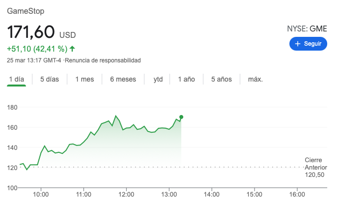 Son mucho los enganchados a las competencias virtuales, lo que contribuyó a que la mayoría de las empresas aumentaran sus ingresos. Tal es el caso de GameStop que dio a conocer sus resultados del cuarto trimestre durante el 23 de marzo, en los cuales se observa que las ventas globales de e-commerce aumentaron un 175% y representan más de un tercio del total de ventas del periodo. Sin embargo, la acción estuvo afectada debido a la intensión de la empresa de sacar más acciones al mercado, es decir, una dilución esperada. Sin embargo, hoy a media sesión sus acciones repuntaban en torno a un 40%.