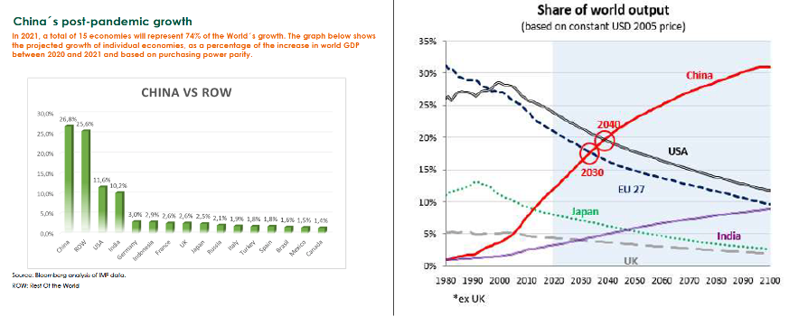 Y aún cuando este dragón esta experimentado desde hace algunos años una desaceleración de su crecimiento económico, es una sana desaceleración. Posiblemente el PIB del 2021 llegue al 8%, que podría ser igual o mayor al de EE.UU. Además, según comenta Bruno Patain, en este 2021 el 74% del crecimiento mundial vendrá dado por 15 países, en donde China representará el 26,8%. No obstante, hacia adelante el PIB seguirá esa sana desaceleración económica pero que en términos de su contribución a la producción mundial seguirá creciendo, sobrepasando a la unión europea en 2030 y a los EE.UU. en 2040.