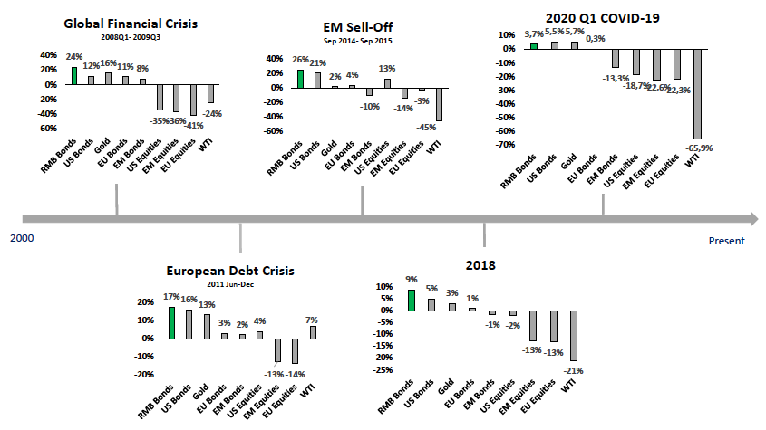 Respecto al mercado de bonos en China, Patain reforzó que en varios periodos el comportamiento de este asset class ha sido como un “safe haven”, claramente descorrelacionados con otros activos, y muestra 5 periodos de turbulencia en los mercados y como los bonos chinos han tenido un desempeño favorable e incluso en algunos casos mejor a otros mercados de bonos. Aporta diversificación a las carteras así como un mejor binomio riesgo/rendimiento: