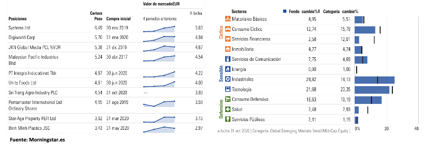 Respecto a la cartera, se trata de una cartera concentrada de entorno a 40 posiciones, en donde el 48% del patrimonio esta representado por las 10 mayores posiciones. En cuanto a sectores, el mayor peso está en Industriales y Tecnología, que suman más del 46%, seguido por Consumo Defensivo y Cíclico que suman más del 27%, con una infraponderación en Financieros (2,6%) y Sector Salud (2,18%):