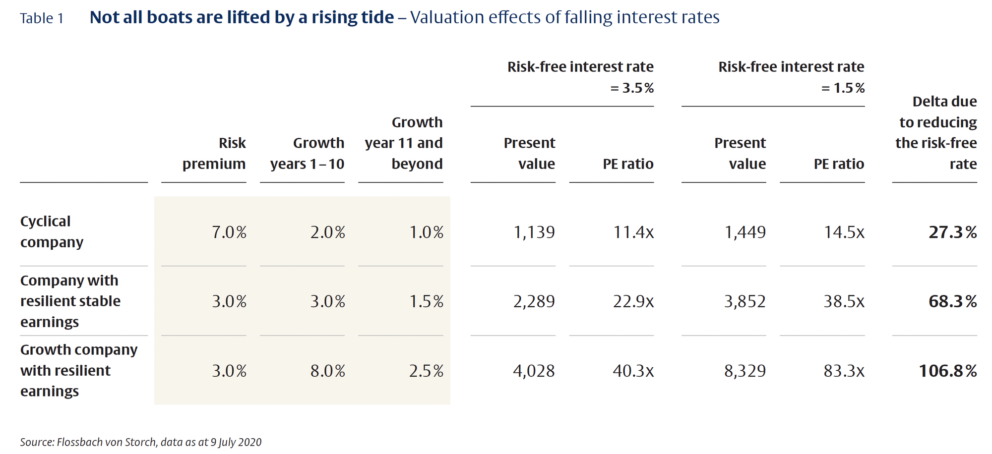 Por lo tanto, una caída sostenida en las tasas de interés genera aumentos superiores a la media en los valores de las empresas con ganancias relativamente resistentes y primas de bajo riesgo. Este efecto es aún mayor para las empresas con una alta probabilidad de crecimiento de las ganancias por encima del promedio, ya que una tasa de descuento baja también aumenta el valor presente del crecimiento de las ganancias, como se muestra dramáticamente en la siguiente tabla: