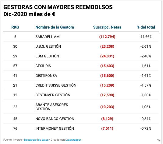 Por el contrario, las gestoras que reportaron los mayores reembolsos mensuales son Sabadell, con reembolsos superiores a los -112 millones de euros, UBS y EDM con salidas que superan los 20 millones de euros.