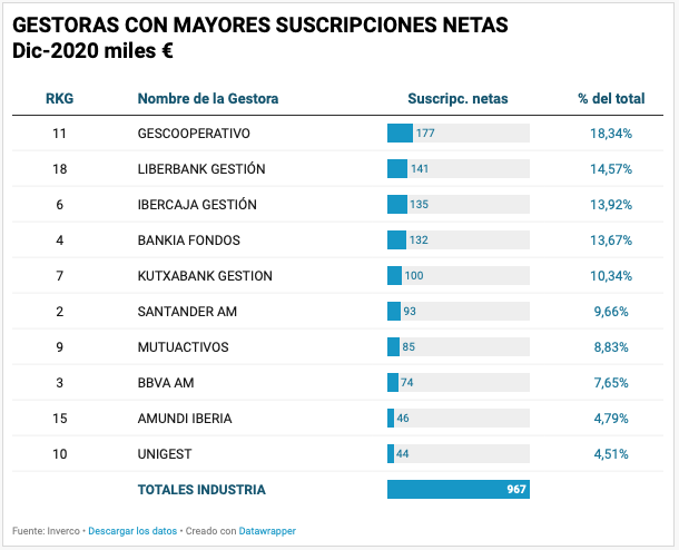 Con datos previos de Inverco y de aquellas gestoras que proporcionan los mismos, durante el último mes de este turbulento 2020 se observa que las gestoras de Gescoperativo y Liberbank registraron las suscripciones netas mayores durante el mes, de 177 millones de euros la primera y que representa un 18,3% del total de suscripciones de la industria que fueron 967 millones de euros, mientras que Liberbank reportó entradas de 141 millones de euros o bien el 14,57% del total. Estas dos gestoras ocupan lugar 11 y 18 por patrimonio.
