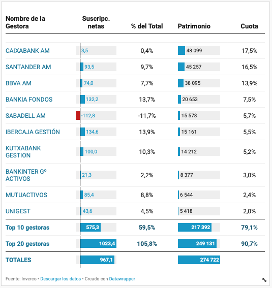 Las suscripciones netas del top 10 ascienden a 575,3 millones de euros, que representa el 59% de las entradas netas del mes. Mientras que, por patrimonio el top 10 acumula unos 217.392 millones de euros, que equivale al 79% del volúmen totales de la industria de fondos española. Si consideramos el top 20, ascendería a representar casi el 91% de los activos, lo que habla de alta concentración del patrimonio la industria. Siguen siendo Caixa, Santander y BBVA las gestoras con una cuota superior al 10% en fondos de inversión. No obstante, las gestoras con mayor incremento mensual en su patrimonio fueron: AzValor (+9%), Dunas Capital (+6,1%), Bestinver (+3,4%) y Mutuactivos (2%).