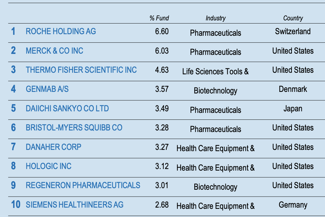 El fondo mantenía una posición de liquidez del 9% al cierre de junio, y estaba invertido en 64 posiciones, entre las que se encuentran las farmacéuticas Roche (6,6% de peso) y Merck (6,03%) y que hace unos días pactaron con la Unión Europea el suministro de medicamentos experimentales que puedan ser utilizados para tratar pacientes de Covid-19; también está la estadounidense Thermo Fisher Scientific – proveedor de soluciones de análisis estructural de materiales entre otras cosas y que en un año ha subido más de un 30%; dos empresas de biotecnología Genmab (que en el congreso de la Sociedad Americana de Oncología de mayo presentó datos actualizados sobre su anticuerpo biespecífico CD3-CD20 para el linfoma no Hodgkins y que en junio cerro un acuerdo de asociación impulsando su valoración en bolsa) y Regeneron Pharmaceuticals (con un peso superior al 3%), entre otras.