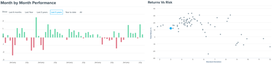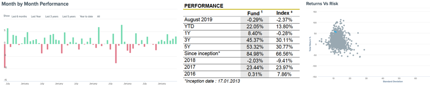 A pesar de ser un fondo con exposición a renta fija de corporativos emergentes, se destaca de sus competidores por su reducida desviación estándar y por sus reducidas caídas en momentos adversos en su historia a 1, 3 y 5 años. Tiene un track record destacado ya que, en 5 años, son pocas las observaciones donde el fondo ha mostrado rentabilidades negativas. Aún así en un periodo de 5 años la rentabilidad ha sido del 17,13% y en lo que va del año lleva un 10,93%, nada despreciable y con una volatilidad anualizada del 2,31%.