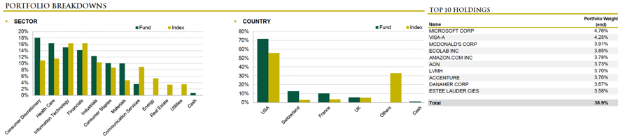 A diferencia del anterior fondo, la volatilidad de este fondo, al ser renta variable aumenta y se ubica en 12,62% anualizado, con una caída máxima (drawdown) inferior a sus competidores y al índice de referencia y un menor periodo de recuperación que el índice (12 semanas contra 47 del índice. Es un fondo con sesgo de crecimiento. Su cartera tiene una sobreponderación a EE.UU., con un peso del 70%, seguido por Suiza (algo más del 10%), Francia (10%) y Reino Unido en torno al 5%. Y en cuanto a sectores, El 60% lo integran empresas de consumo discrecional, salud, tenconología y financiero. No tiene exposición a energía, eléctricas ni inmobiliario.