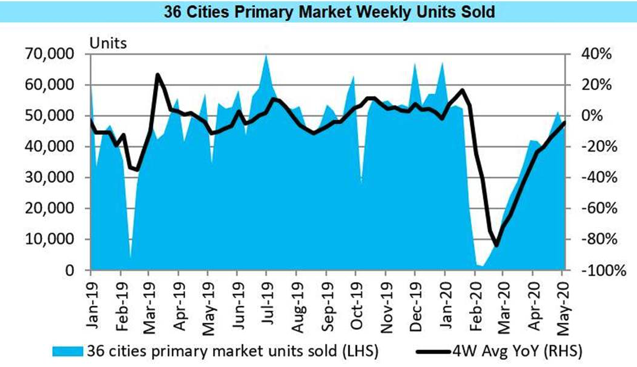 Sabrina Ren, gestora de fondos de renta variable en JK Capital Management, una filial del Grupo La Française - especializada en mercados asiáticos, comenta que tal y como era de esperar, las ventas inmobiliarias chinas están al alza. Los datos de la industria muestran que a día 3 de mayo, las ventas semanales de las 36 ciudades más grandes en volumen estaban volviendo a los niveles anteriores a la COVID 19, mientras que los precios de los inmuebles estaban mostrando una resiliencia notable. En cuanto a los 36 principales promotores inmobiliarios, su crecimiento de preventas se recuperó en una base promedio ponderada a +2% en abril de 2020 frente a abril de 2019.