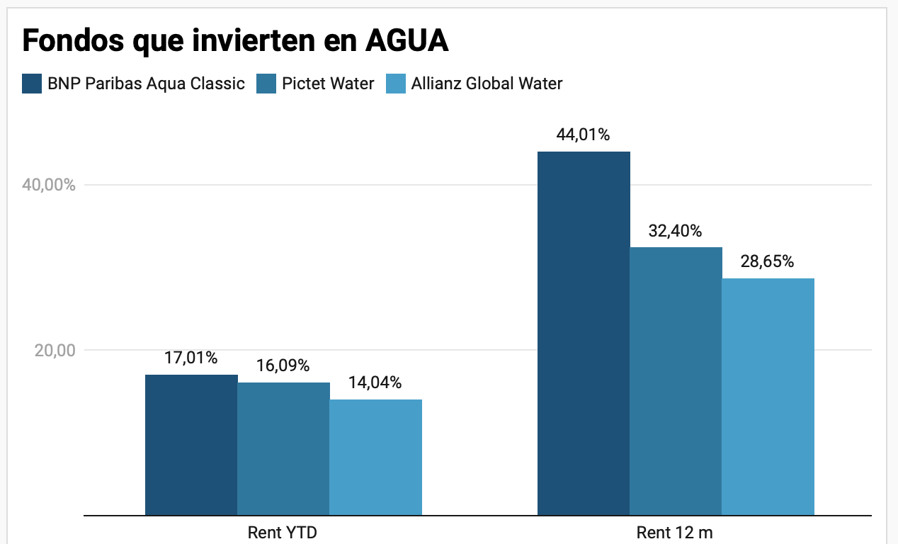 - Allianz Global Water: cuenta con una antigüedad superior a los 4 años, alcanzando un patrimonio cercano a los 620 millones de euros que están invertidos en un 94,3% en 38 posiciones, representando casi un 40% las 10 mayores posiciones entre las que vuelve a aparecer American Water Works y Danaher Corp., entre otras. Alcanza una ponderación del 56% en Norteamérica y un 39% en otras regiones. Logra un estilo más marcado al crecimiento. Con esa cartera caracterizada por mayor concentración alcanza una rentabilidad en lo que va del año del 14,04%, mientras que a 3 años acumula algo más del 50%. Es un artículo 8 de acuerdo con la categoría SFDR y en Morningstar tres estrellas.