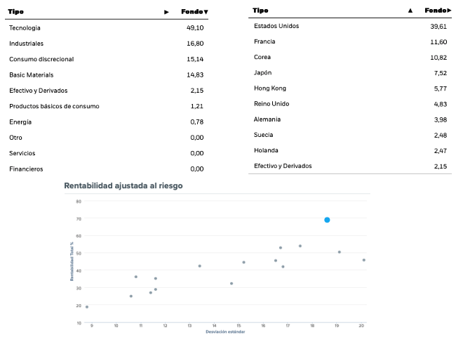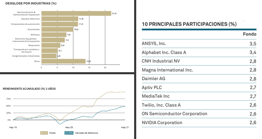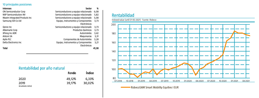 - RobecoSAM Smart Mobility Equities: Es un fondo de gestión activa, de renta variable global que se beneficia de la megatendencia de los vehículos eléctricos, integrando en el proceso de selección de valores criterios de sostenibilidad. En fondo se lanzó en agosto de 2018 y desde entonces lo gestiona Thiemo Lang, miembro del equipo de Thematic Investing basados en Zúrich. Alcanza un patrimonio que ronda los 885 millones de euros, invertidos en 50 posiciones y con una baja rotación (33,4%), donde las 10 mayores representan el 41,4% del fondo. Es un fondo con mayor sesgo a crecimiento y empresas de tamaño medio. Una cartera bien diversificada por regiones, donde Norteamérica representa el 40,7% del fondo, seguido por un 19,2% de Europa Desarrollada, 15,4% de Asia Desarrollada y del 10,6% de Asia Emergente, 10,9% en Japón y 2,4% en Latinoamérica. Entre las principales posiciones existe un peso superior al 21% en semiconductores (el autentico oro en estos momentos), así como empresas relacionadas con la industria.