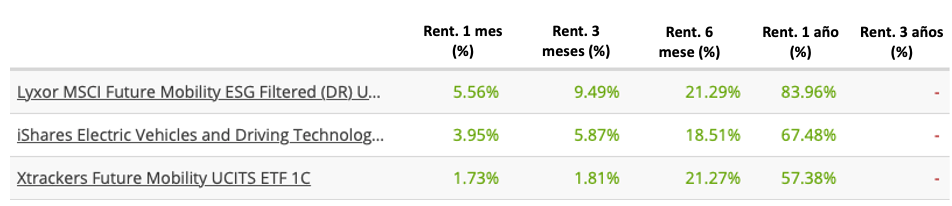 El TER más bajo es el de Lyxor MSCI Future Mobility ESG Filtered del 0,15% anual, le sigue Xtrackers Future Mobility con 0,35% y iShares Electric Vehicles and Driving Technology del 0,4%.