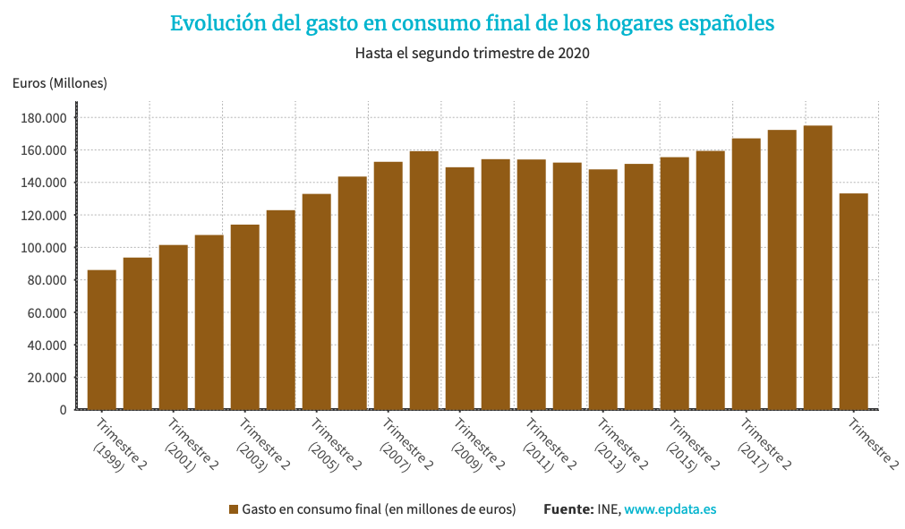 El consumo de los hogares españoles (que representa el 65,9% del PIB) de acuerdo con datos trimestrales del Banco de España mostró una caída sin precedentes en la serie histórica del 20,4% en el 2T2020, y se ubica en niveles similares a los del 2T2005.