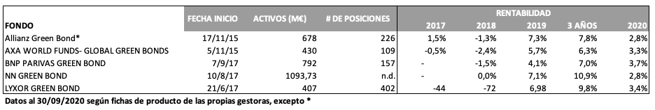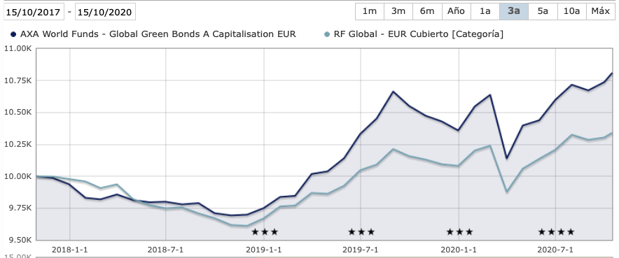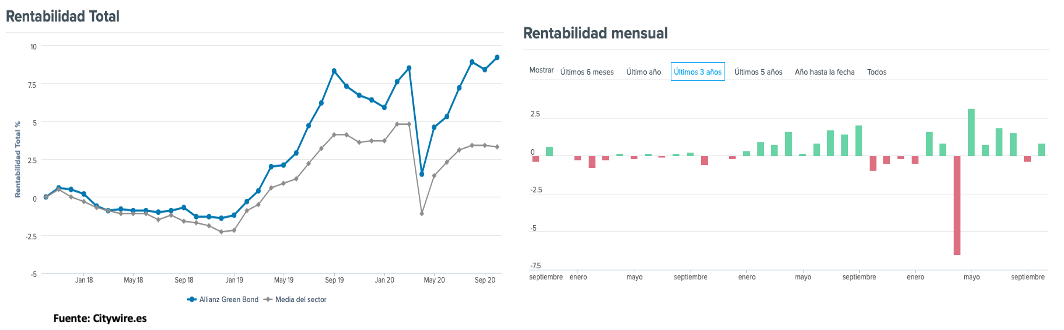 Un fondo de gestión activa de una gestora muy reconocida por sus implicaciones en temas ESG, el Allianz Green Bond, con un track record de algo más de 4 años y cuenta con activos por 680 millones de euros. Alcanza una rentabilidad en el año (al cierre de septiembre) de 2,78%. El fondo es gestionado por Hervé Dejonghe, que cuenta con más de 15 años de experiencia en el sector. Es un fondo de gestión activa con el objetivo de superar a su índice de referencia (BofA ICE BOFAML Green Bond Index), invirtiendo un mínimo del 85% de los activos en bonos verdes.