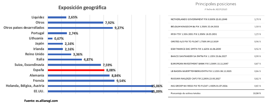 Su cartera esta posicionada con un 15% en EE.UU, otro 15% entre Holanda, Bélgica y Austria, 9,6% en Francia, y 8% en España, entre otros. Entre las principales posiciones destaca Banco Santander, Adif-Alta Velocidad, BBVA, Bankinter, Iberdrola y Red Eléctrica. El fondo alcanza una volatilidad a 3 años del 5,03% (media de la categoría) y una duración efectiva de 7,44 años, y una calificación media de la cartera A. Morningstar le otorga 4 estrellas.