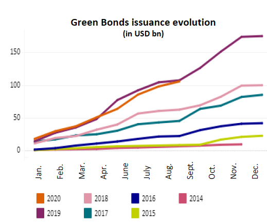 Como ya comentábamos en una nota anterior, el mercado de bonos verdes puede llegar hasta los 2 billones de euros a finales de 2022, lo que implica crecimientos de gran magnitud. Entre los jugadores de importancia a nivel mundial están agencias supranacionales, corporativos y bancos de EE.UU., China y Europa. Las emisiones en lo que va de 2020 sin significativas, aún cuando en 2019 fueron altas. Según el gestor de Axa IM, se espera un fin de año con muchas emisiones.
