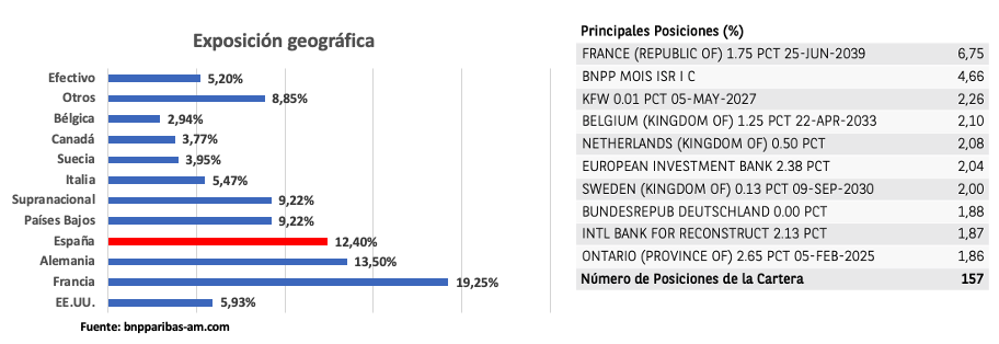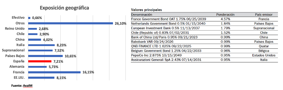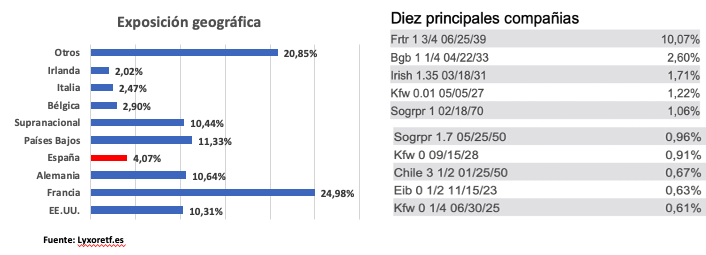 En cuanto a la exposición por países, el mayor peso es Francia, seguido de Países Bajos, Italia, Supranacional y EE.UU. También tiene exposición a España, del 7,21%, aunque ninguna de las posiciones está entre las Top10. La calificación media ponderada es de BBB+, con un vencimiento medio de 8,57 y duración efectiva de 7,6, con un cupón medio del 1,6% y yield to worst de 0,67.