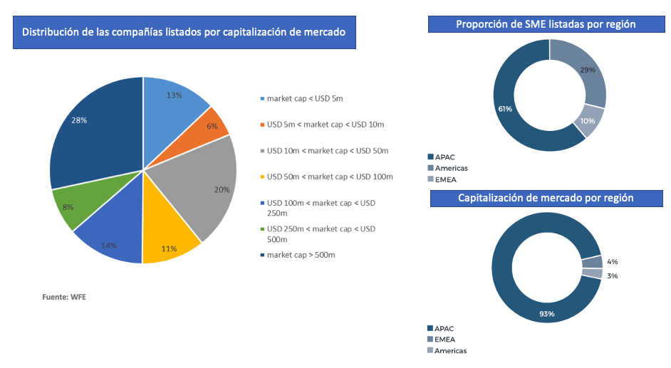 Según datos disponibles, en 2017 había un total de 6.807 empresas que alcanzaban una capitalización de mercado total de más de 1.3 billones de dólares que cotizaban en 33 mercados de pymes en 29 bolsas miembros del WFE. El 61% de ellas cotizaban en mercados de Asia Pacífico (APAC), el 29% en América y el 10% en EMEA y con una distribución por capitalización de mercado como se observa a continuación:
