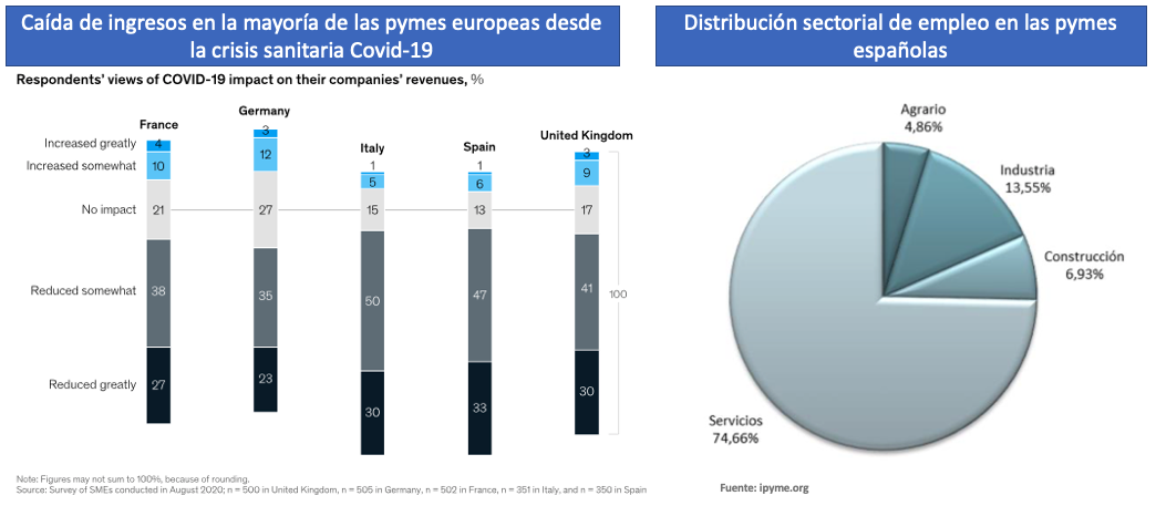 En una encuesta realizada por Mckinsey, se observa que son las pymes españolas las que más han sufrido el recorte de sus ingresos por la pandemia. Y esto no es de extrañar ya que el confinamiento, cierre de bares y restaurantes y otras medidas tomadas por las distintas autoridades, han llevado a muchas de éstas a cerrar la cortina, con lo que ello implica para el empleo. Tan sólo el sector servicios (datos a marzo de 2021) genera un total de 11,7 millones de empleos, el 74,7% del total de las pymes. Le sigue el sector industrial (2,1 millones), construcción (1,1 millones) y agrario (961 mil), según el portal PYME del Ministerio de Industria, Comercio y Turismo. Es por ello, la importancia de los programas de apoyo que se puedan brindar a estas empresas y que puedan superar la pandemia.