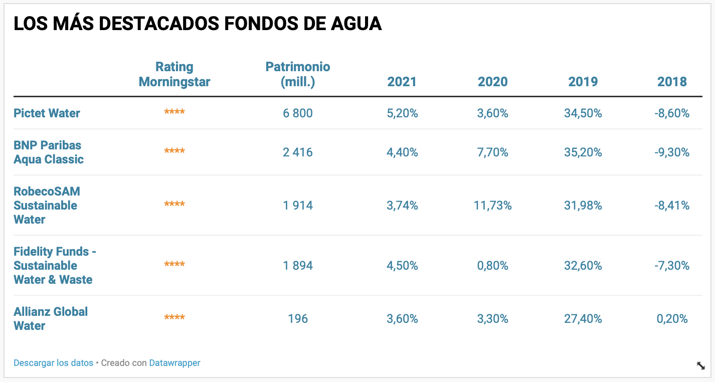 Y respecto a carteras, vemos que hay ciertos valores que se repiten en varios de los fondos, como Thermo Fisher Scientific (+56% a un año), American Water Works (+28%), Xylem (+34%), Suez (+21%) y Veolia (-10%), todos ellos muy relacionados con la temática del agua.
