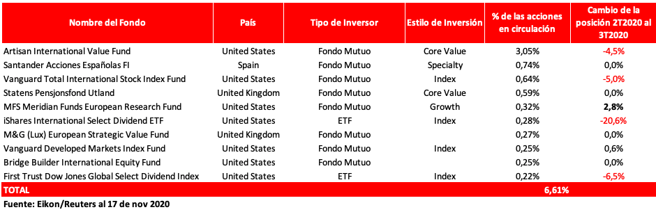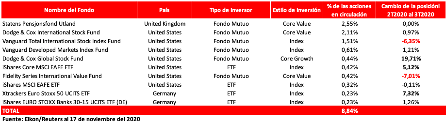 Entre los 10 principales fondos de inversión con participación en las acciones en circulación del Santander hay 6 fondos mutuos, de los cuales 5 son de los Estados Unidos y uno del Reino Unido, hay 4 gestores de ETFs. El fondo Dodge & Cox Global Stock Fund aumentó en 19,7% su posición del segundo al tercer trimestre del año, al igual que el ETF de iShares Core MSCI EAFE que lo hizo en 5,12%. Por otro lado, el fondo Fidelity Series International Value fund redujo su posición en 7,01% en el trimestre, al igual que el fondo mutuo Vanguard Total International Stock Index: