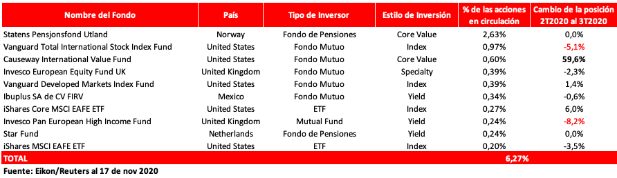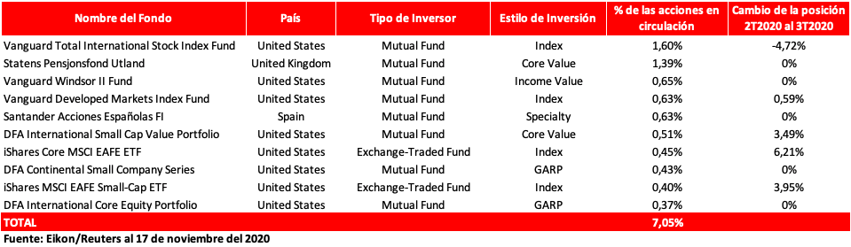 Respecto a los 10 mayores fondos tenedores de acciones de BBVA destacan 8 fondos mutuos y dos ETF. Dentro de los fondos mutuos, 3 son value, 3 son growth y dos indexados. También destaca el fuerte incremento que ha tenido el fondo American Fund Euro Pacific Growth Fund del segundo al tercer trimestre, así como Causeway International Value Fund (+89,4%) y el ETF de BNP Paribas Easy S&P500. Por el contrario, el fondo Vanguard Total Inetrnational Stock Index redujo su participación en 6,43% en el periodo.