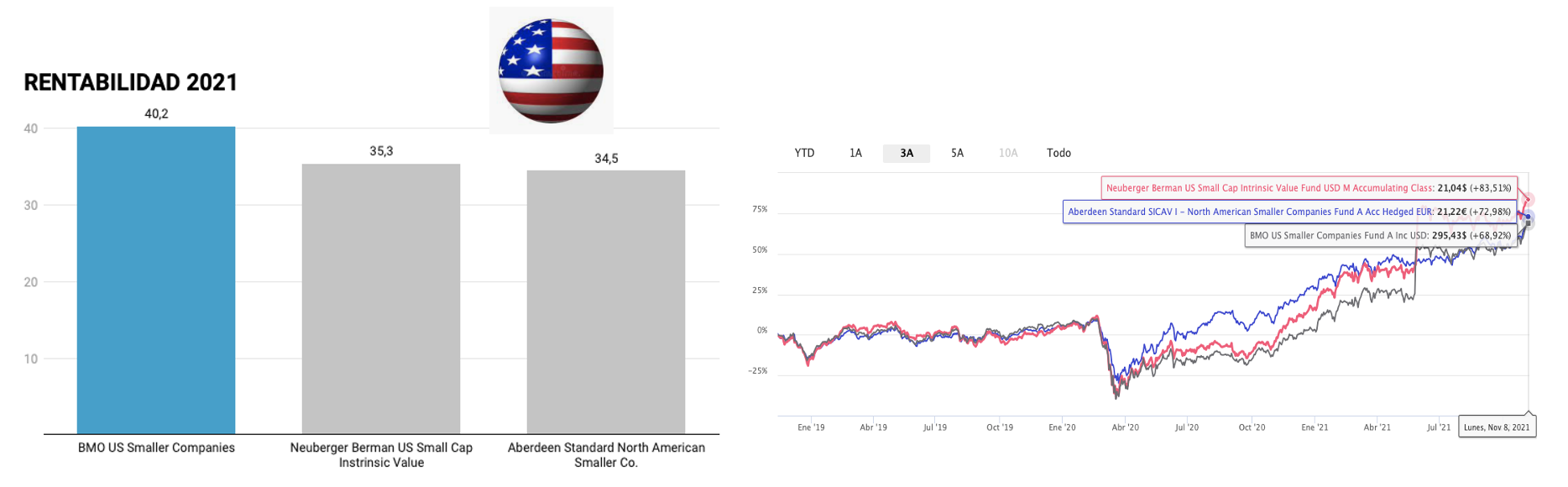 Y en cuanto a Small Caps EE.UU., el fondo con mayor rentabilidad en 2021 es BMO US Smaller Companies, con un patrimonio de solo 19 millones de dólares pero con una cartera lo suficientemente diversificada, apostando fuertemente por el sector salud y servicios financieros. Entre sus principales posiciones está Deckers Outdoor, ArcBest, Sleep Number, entre otras. El fondo es consistente en su desempeño a tres años.