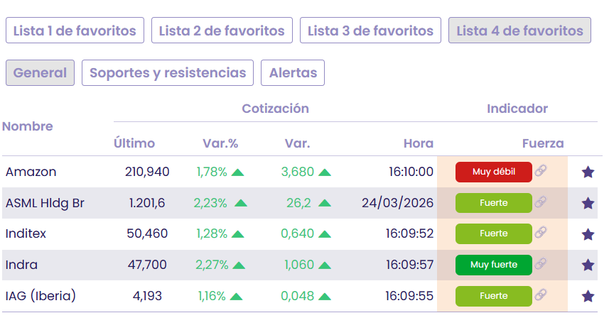 Podemos en la sección de "favoritos" de Estrategias de Inversión, podemos crear listas y ver el indicador premium de fuerza y tendencia de cada uno de los valores que tengamos en esas listas.