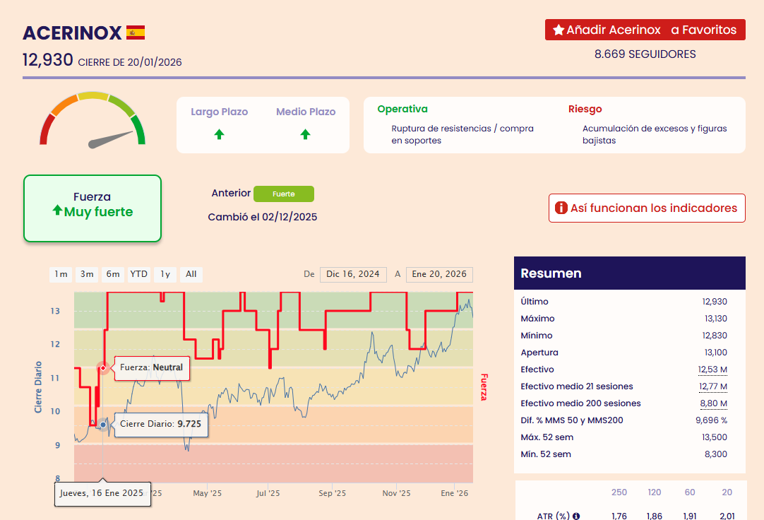 De hecho, el valor cambio de ciclo bursátil el pasado 17 de enero de 2025 , que cotizaba a 9,73 euros la acción. Desde entonces ha pasado a 12,93 euros Es decir ha subido un 32% desde que dio esa señal.