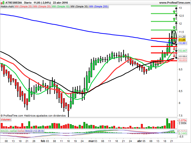 Las medias de 10, 20, 30 y 200 actúan de soporte. El volumen acompaña al valor. El macd está en sobrecompra. La vela del viernes al cierre es una pauta envolvente bajista. Si la vela del lunes cierra por debajo de la previa, el valor podría corregir.