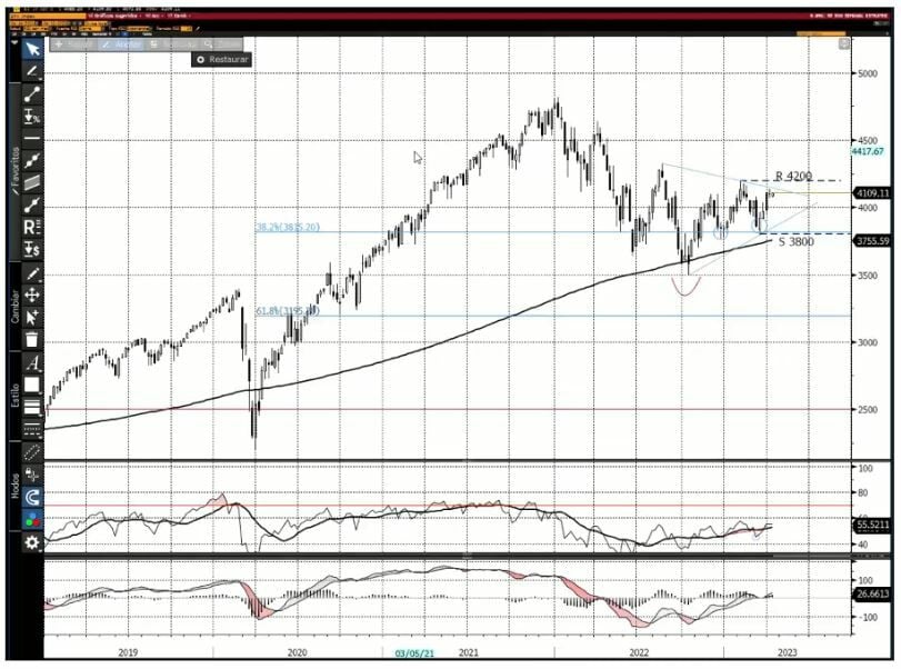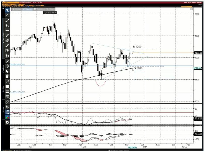 En los análisis de las semanas anteriores hemos marcado el Fibonacci del retroceso 38,20 desde el mínimo de diciembre 2020 hasta el máximo de enero 2022, que pasa por la zona de los 3.815 puntos.