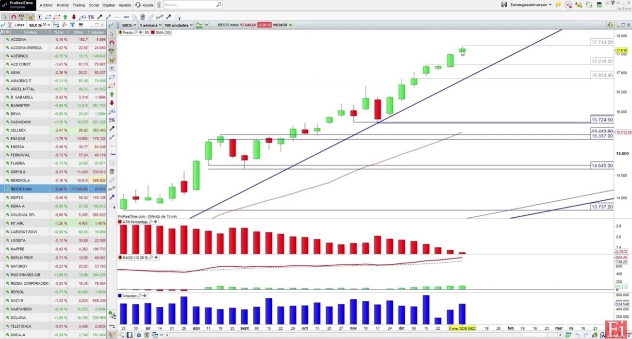 Para Álvaro Nieto, analista de mercados financieros de Estrategias de Inversión, nos encontramos ante la formación de una posible vela doji que nos puede aportar ligeras señales sin certidumbre de cara a las próximas semanas de continuar con la tendencia alcista de las últimas semanas, puesto que esta vela semanal ya sería la octava semana de subidas en el principal índice español, por lo que podríamos estar ante posibles señales de consolidación que podrían avecinarse a partir de la presente vela.