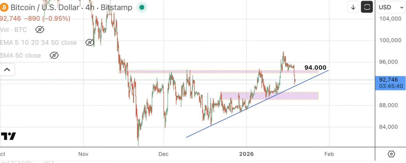 Sobre Bitcoin, afirma que está “enjaulado” en un rango lateral entre 90.000 y 100.000, con un “muro” en la zona 98.000–100.000 hasta la expiración del 30 de enero. La caída hacia 92.000 se debe a la ruptura de soportes y saltos de stops, pero destaca que “no ha roto ni la primera directriz alcista”. Mientras se mantenga por encima de 92.000, lo más probable es un movimiento lateral, sin “ventas masivas”.