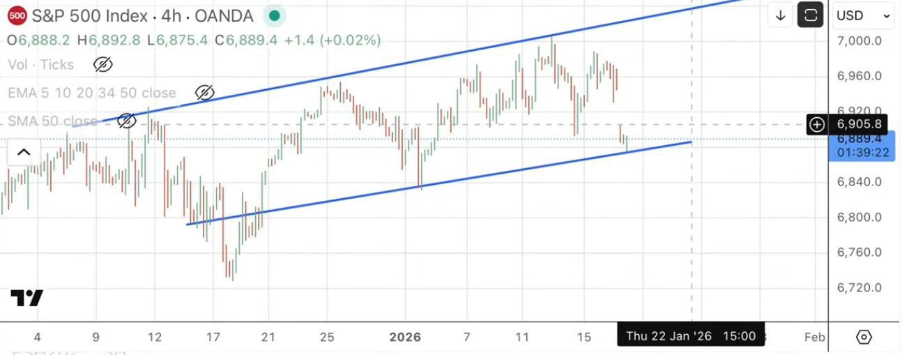 En el S&P 500, tras la pérdida del soporte en 6.920 y la caída a 6.875, señala que no se ha roto el canal. La tendencia alcista de muy corto plazo se ha detenido y espera lateralidad, siendo clave recuperar los soportes para confirmar que “no habría pasado nada”.