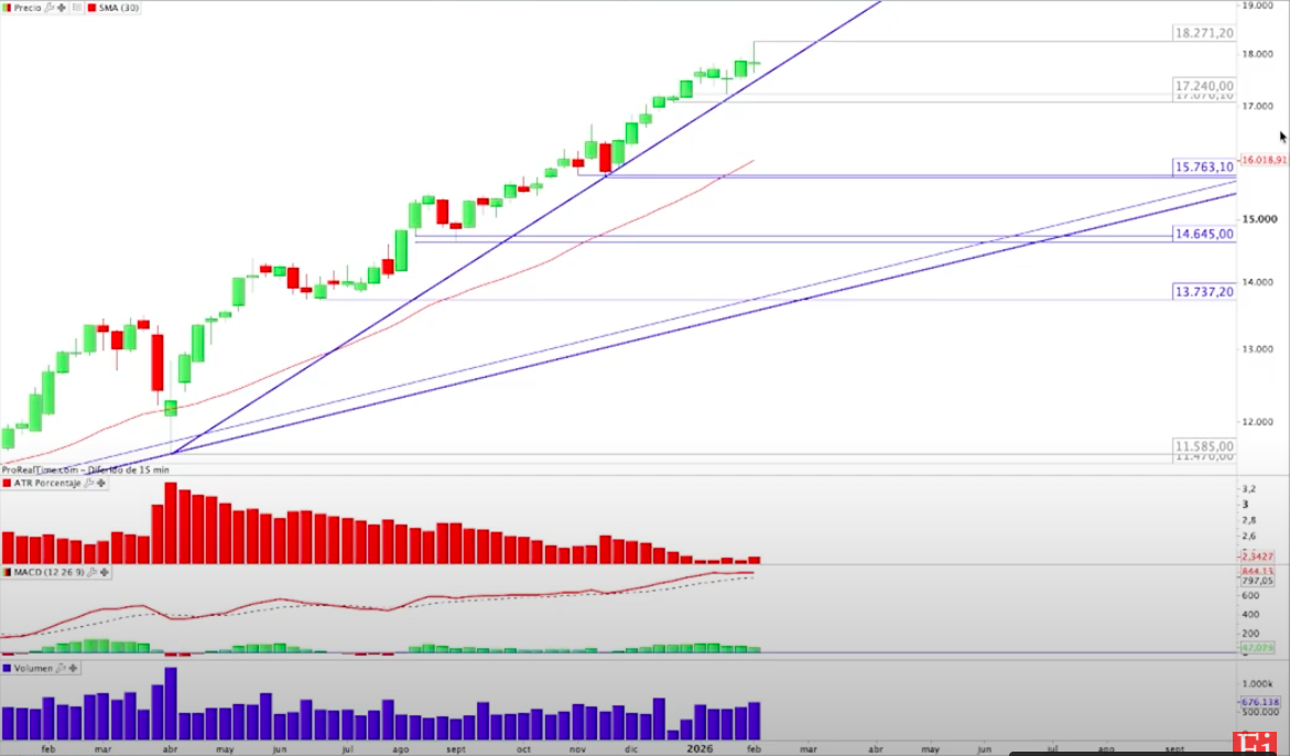 Mientras el Ibex 35 no cierre velas semanales por debajo de la directriz alcista de medio plazo, trazada desde los mínimos de abril de 2025, la hipótesis más probable sigue siendo la continuación del registro de nuevos máximos históricos, superando los 18.271 puntos.