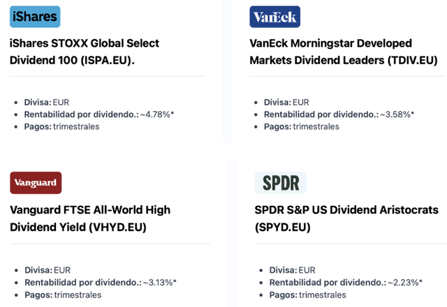 ETFs de dividendos como iShares STOXX Global Select Dividend 100 (ISPA.EU) o VanEck Morningstar Developed Markets Dividend Leaders (TDIV.EU), ideales para generar rentas periódicas.