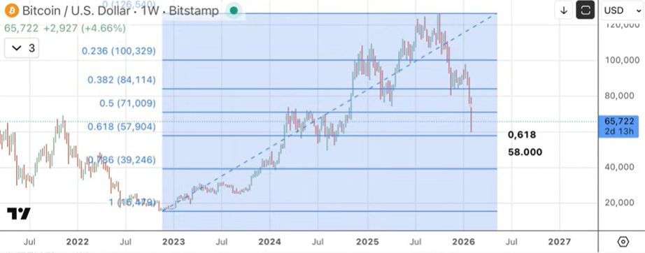 En Bitcoin, el sentimiento es extremo: “nos morimos de miedo”, con “pánico y desolación”. La caída se ha producido “fundamentalmente vía futuros”, con aumento del open interest y “gamma negativa”, lo que amplifica la volatilidad. Técnicamente, Bitcoin ha corregido el “0,618 de toda la subida” desde octubre de 2022 hasta octubre de 2025, alcanzando la zona de “58.000”, cerca del coste variable de minado, situado en torno a “54.000”.
