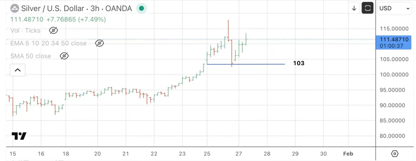 Destaca que el ETF de la plata registró “el mayor volumen negociado de la historia”, lo que interpreta como una fuerte realización de beneficios. Considera que oro y plata están siendo “sofronizados”, es decir, forzados a un movimiento lateral antes de seguir subiendo, porque “este sistema financiero está roto” y “está peor que cuando Bretton Woods”.